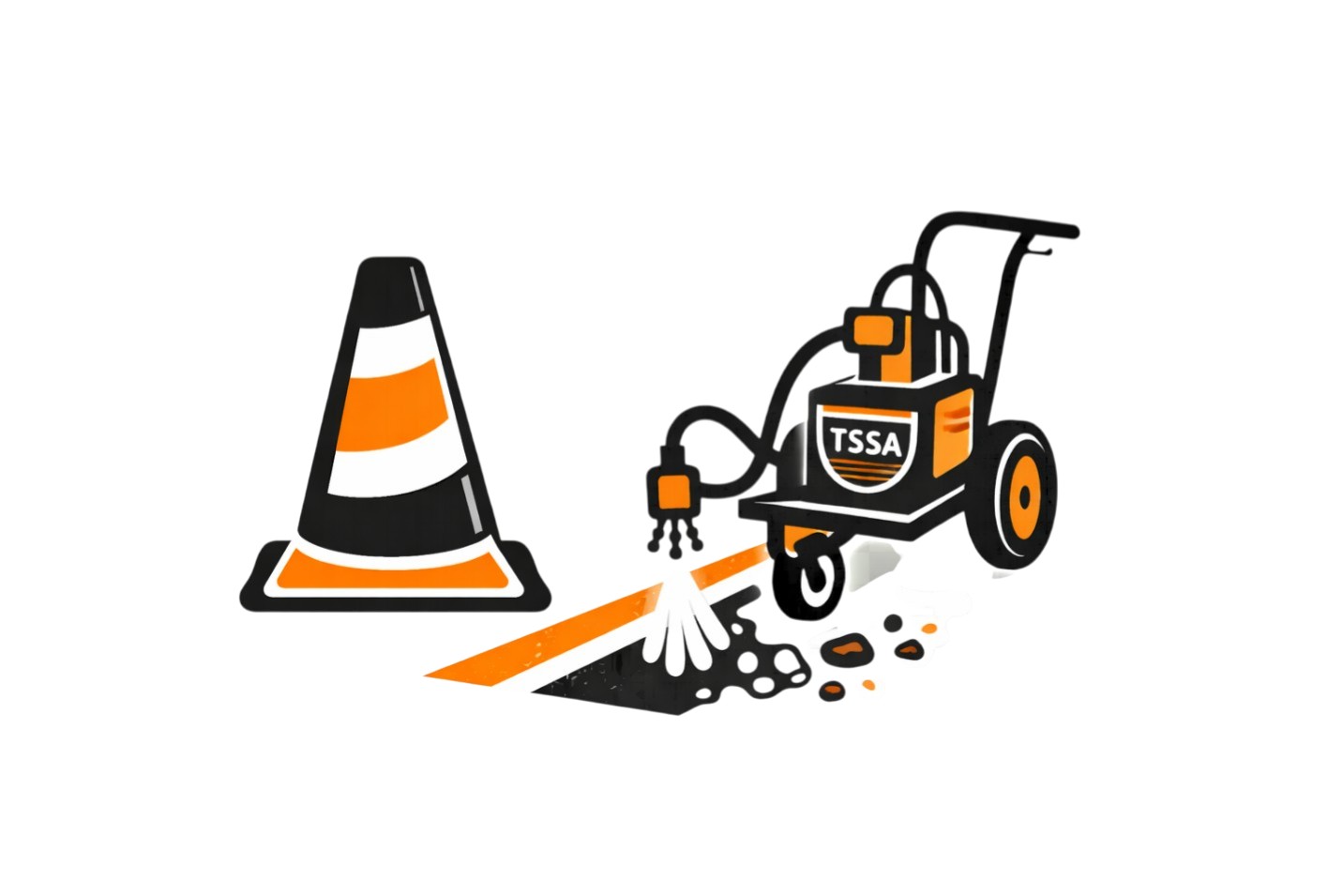 Before applying traffic paint, the asphalt surface must be thoroughly cleaned. Industrial blowers, wire brushes, and pressure cleaning remove dust, dirt, road salt, and debris that accumulate during winter months. Proper preparation allows the paint to bond directly to the pavement for longer durability.